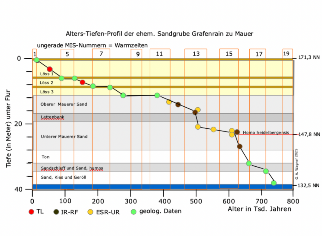 Ein Höhepunkt unserer Forschung war die Datierung des Homo heidelbergensis. Jede historische Wissenschaft benötigt ein Zeitgerüst, das überlieferte Ereignisse nach ihrer chronologischen Abfolge ordnet. Erst dadurch lassen sich die Ereignisse untereinander in zeitliche Beziehung setzen und kausale Zusammenhänge erkennen. Das betrifft auch den Homo heidelbergensis aus Mauer. Die Untersuchung der Fauna; vor allem die Kleinsäuger, aus der Fundschicht ermöglichen die stratigraphische Korrelation mit den marinen Sauerstoff-Isotopenstufen MIS-13 oder MIS-15, was etwa 500.000 bzw. 600.000 Jahren entspricht. Radiometrische Datierungen ergeben numerische Alter, also direkt in Jahresangaben. Dies gelang nun erstmals – zusammen mit Kollegen aus Paris und Freiberg -, und zwar mit zwei verschiedenen Methoden an Zähnen und an Sandkörnern aus der Fundschicht. Aufgrund dieser Datierungen von 609.000 +/- 40.000 Jahren gehört der Mauerer Homo heidelbergensis in die MIS-15 Warmzeit. Er ist damit der früheste seiner Art in Europa.